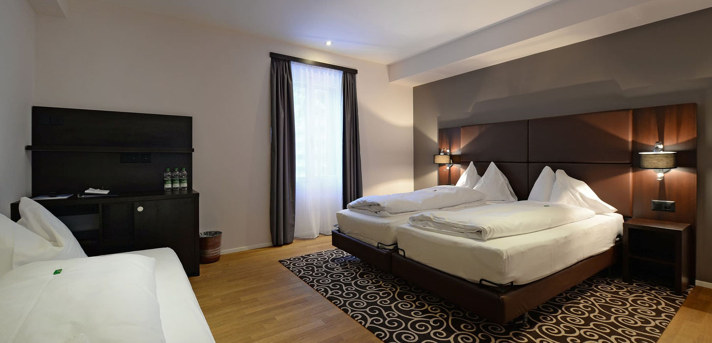 Our spacious triple rooms are ideal for parents with one child. However, these rooms can also accommodate three adults. All rooms have a private bathroom with shower or bathtub. Some of our triple rooms have a balcony that offers a wonderful view of the mountains.